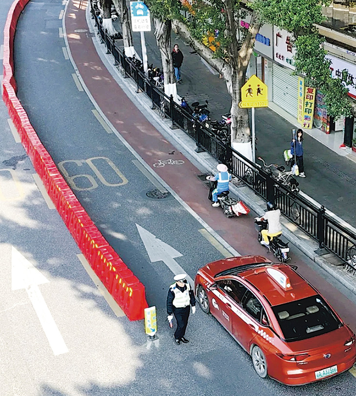 上月廣州交警宣布,於荔灣、海珠、天河、白雲4處路段增設機動車與非機動車混行車道。混行車道以紅色水馬分隔,既防止電雞穿梭其他行車線,亦防止私家車違泊於路邊影響電雞行駛,以期疏導車流。