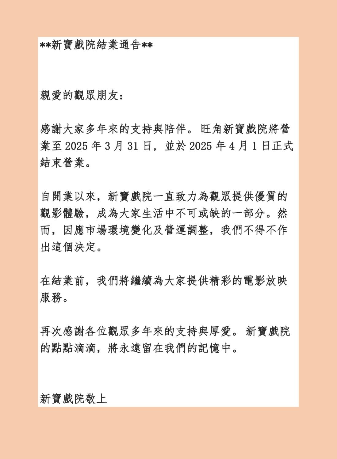新寶院線今夜在 facebook 發帖附上新寶戲院結業通告,宣布戲院將營業至本月31日,並於下月1日正式結業,謂「在結業前,將繼續提供電影放映服務」。