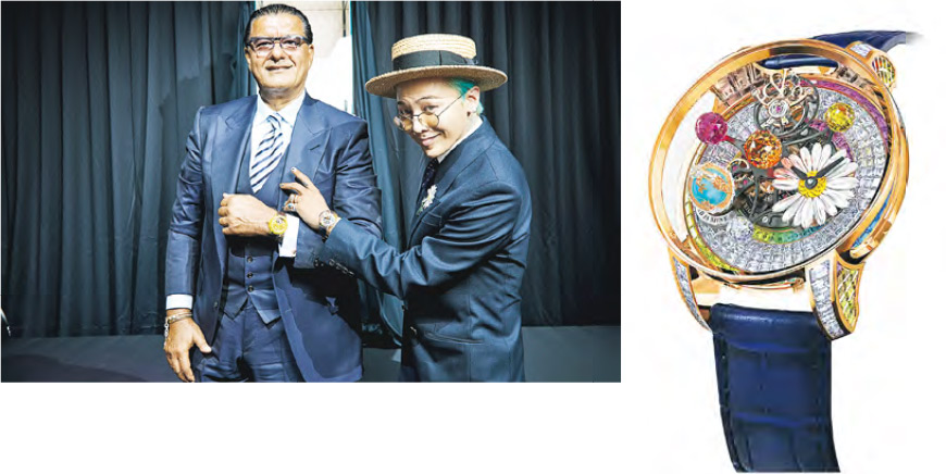 訂製款以Astronomia Solar Baguette腕表為藍本,採用白色鑽石和彩色藍寶石的組合,以綠色和紫色為設計主調,旋轉裝置上的衛星設計同樣為特別訂製。標準的地球儀圖案改成G-Dragon最愛的綠松石顏色,上面纏繞着一隻龍脊呈白色的玫瑰金龍,下方圓環則刻着他的標誌宣言:The world is mine。 腕表鑲嵌的寶石採用品牌Jacob Cut切割,各有288個切面,顏色選自G-Dragon個人偏愛的橙色、白色、粉紅色和綠色,腕表底蓋亦刻上G-Dragon最新專輯名稱Ubermensch以及Astronomia for G.D.的字樣。但腕表上最搶眼的,應該是缺少了一瓣的雛菊造型時分表盤,呼應其個人品牌的雛菊主題。●