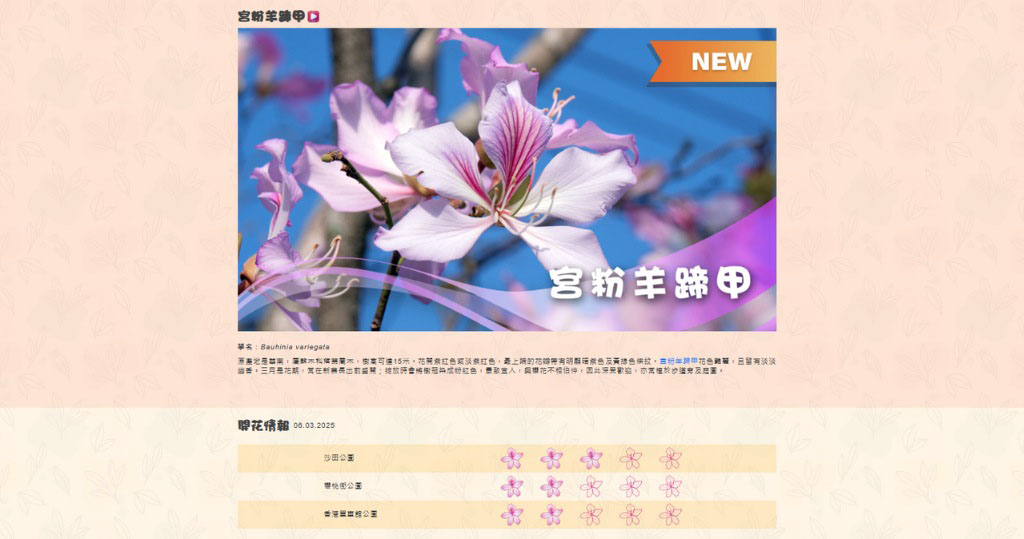 即時熱點 宮粉羊蹄甲賞花情報|沙田公園、櫻桃街公園、單車館公園陸續開花 (09:18) 發佈於 11 個月 前 2025 年 3 月 13 日 By 明報 宮粉羊蹄甲陸續開花,康文署網站「康文賞花情報」新推出宮粉羊蹄甲賞花情報,沙田公園的開花指數達3朵花(滿開是5朵花)。大角嘴櫻桃街公園和將軍澳香港單車館公園的開花指數是2朵花。[詳情][圖輯:屯門宮粉羊蹄甲花海] 沙田公園 櫻桃街公園 單車館公園 圖輯:屯門宮粉羊蹄甲花海 相關文章:圖輯:屯門宮粉羊蹄甲花海宮粉羊蹄甲熱門HOTPICK編輯推介賞花賞花情報 Up Next 天氣|天文台:日間溫暖 市區最高26°C (08:46) 不要錯過 香港花卉展覽2025短片率先睇 維園花展3月14日起舉行 主題花秋英可點綴環境、食用入藥【附花展入場資訊】 (13:15) 繼續閱讀 贊助商 猜你喜歡 奶茶學問|短片︰專家示範撞茶技巧、講解茶葉及奶茶杯特色 (13:44) 內地文創產品掀起購買熱潮 「00後」為消費主力軍 (11:00) 「馬丁」變「牛丁」 內地男模仿韓團CORTIS隊長Martin爆紅成熱話 (16:13) 麥當勞推新年限定玩具 台灣麥當勞十二生肖公仔可換裝 港推My Melody & Kuromi水晶麻將 (10:59) 荃灣如心園新年嘉年華一連兩日免費入場 睇醒獅、製作秦淮魚燈|農曆新年好去處 (10:15) 櫻花|短片:沙田安景街櫻花盛放【多圖】 (14:42)