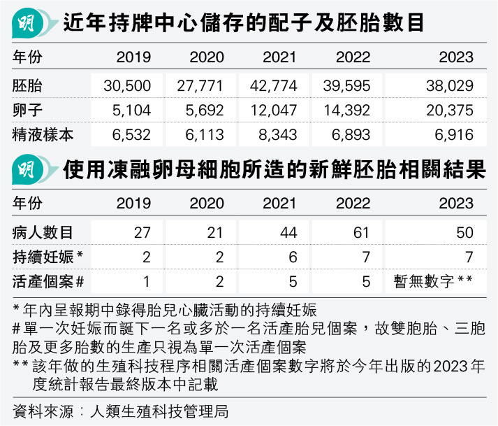 局方數據顯示,本港持牌中心儲存的卵子由2019年5104個,急增至2023年20,375個,惟同期各年僅雙位數病人使用凍融卵子,介乎21至50人。同期持續妊娠個案各年介乎2至7宗,撇除前年暫無數字,活產個案介乎1至5宗(見表)。