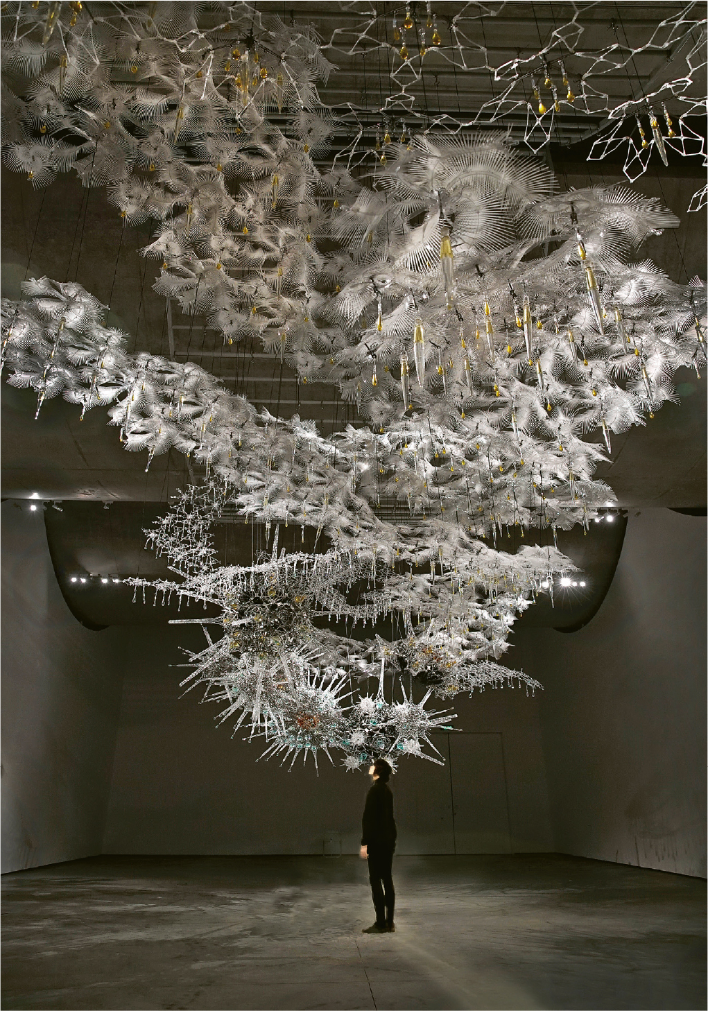 跨領域,說來輕巧。將行為藝術拍成照片,打印成冊,便可「跨領域」成為視覺藝術;AI生成圖像與詩句,科技與文化藝術的「跨領域」結合也早已氾濫。但展覽想探索的跨領域顯然不止於此。展覽中,有加拿大雕塑家Philip Beesley作品《星群》,巨大的「蕾絲網」籠罩在展廳中,有着不同的形狀與密度,遠遠望去,宛如懸在空中的浮雲;燈光照射下,又似宇宙中的燦燦星河。走近看才發現,空中的「蕾絲」竟然是玻璃與不鏽鋼,「浮雲」與「星河」其實是各種形狀的細胞——「他的靈感源自細胞結構和微觀生物學,雕塑精緻的蕾絲結構其實是模擬礦物質和聚合物如何演變為生物系統」。聚合、演變、生命誕生——置身裝置下抬頭往上看的觀眾,原來才是最重要的部分。