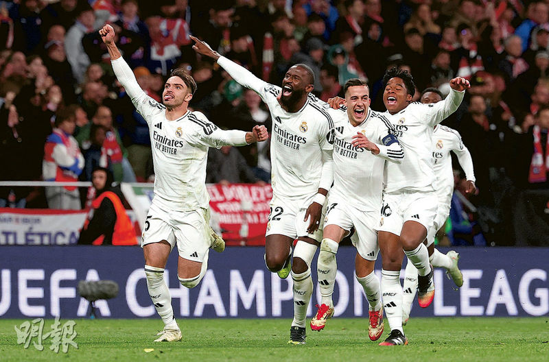 【明報專訊】衛冕的皇家馬德里昨在歐聯16強次回合作客以0:1負馬德里體育會,總比數被逼和2:2,兩軍加時後賽果不變,終藉敵鋒祖利安艾華利斯在互射12碼操刀時疑因跣腳兩度觸球,在視像裁判(VAR)介入後判入球無效,令「銀河艦隊」贏4:2,8強對手是以總成績9:3淘汰燕豪芬的阿仙奴。馬體會主帥施蒙尼賽後為出局忿忿不平,更反問「有誰看到觸球兩次?請舉手!」