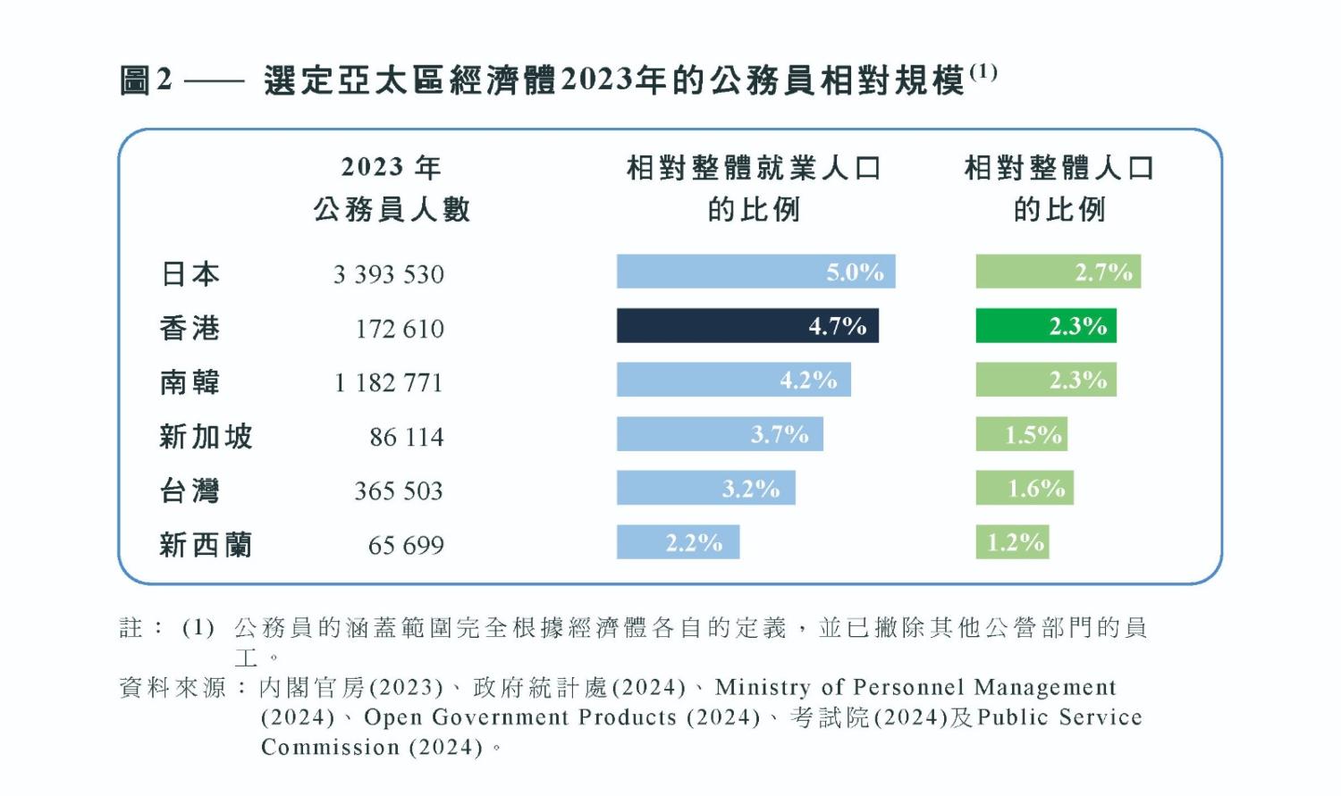 《研究簡報》亦比較不同亞太區先進經濟體的公務員編制規模,發現本港公務員佔整體就業人數的比例於2023年為4.7%,高於韓國及新加坡等,並稱根據部分亞洲國家的成功例子,人工智能對提升公務員效率具顯著潛力。