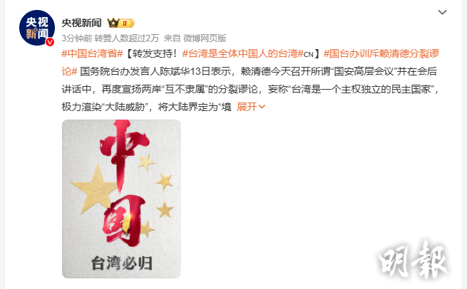 大陸國台辦發言人3月13日晚上針對台灣賴清德推出抵制大陸措施發表聲明後,新浪微博「央視新聞」、「人民日報」等央媒帳號相繼轉載國台辦聲明,並製作「統一」圖卡,呼籲網民轉發支持。