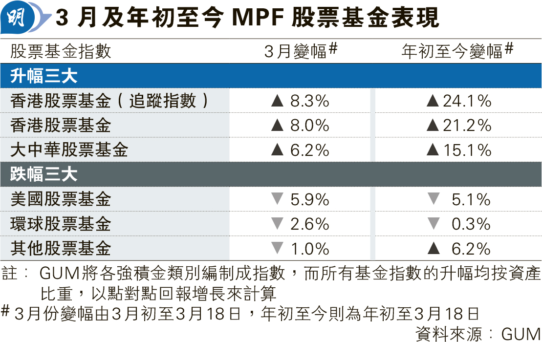 按GUM將各MPF資產及基金類別,編制成指數計算其變幅,於股票基金類別之中,香港股票基金(追蹤指數)及香港股票基金,於3月內(3月至3月18日)及年初至今(年初至3月18日)表現較好(見表),兩者月內分別上升8.3%及8%,年初至今亦分別上升24.1%及21.2%。月內GUM強積金綜合指數上升1.2%至258.3點,年初至今則上升5.3%。