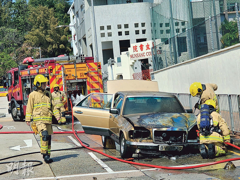 【明報專訊】一輛車齡約45年的古董平治房車,昨早駛至九龍城東寶庭道燈位時,車輛冒煙起火,六旬男車主及時離開車廂。消防到場開喉將火救熄,車輛引擎位置嚴重焚毁,事件中沒有人受傷。車主對愛驅焚毁感心痛及可惜。