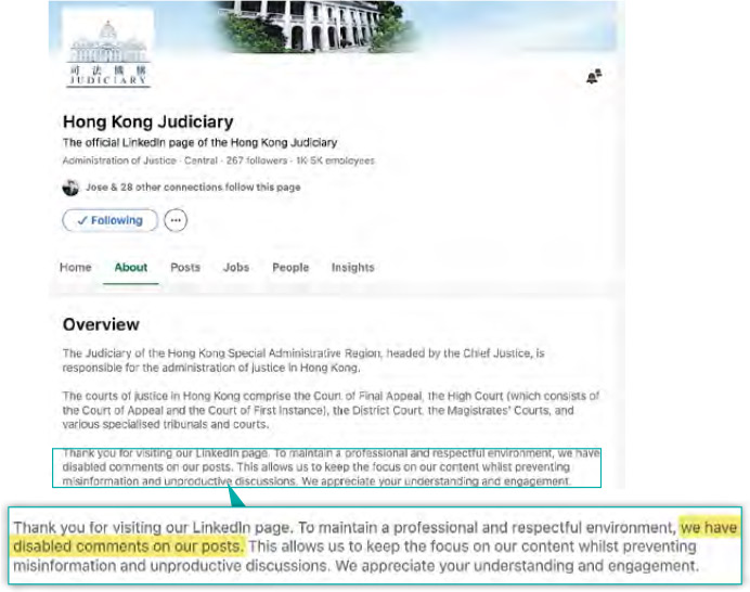 睇番香港司法機構LinkedIn專頁,就熄咗帖文留言功能,司法機構解釋,為咗維護專業同保持互相尊重嘅環境而咁做,令大家可以聚焦番內容,防止虛假資訊同無幫助嘅討論。