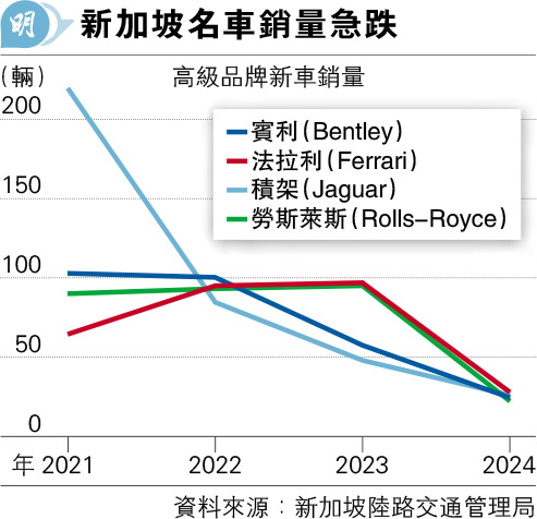 【明報專訊】新加坡早前爆出建國以來最嚴重的洗黑錢醜聞後,當局加強打擊。英國《金融時報》(FT)周一(24日)報道,不少新加坡人都避免炫富,因此停止購買名車,導致去年一些高級汽車的銷量暴跌達四分之三。