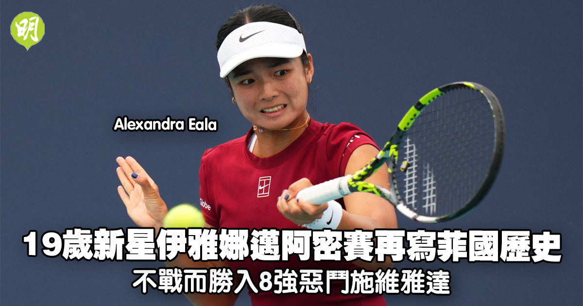 19歲菲律賓籍新星伊雅娜(Alexandra Eala)在今屆邁阿密網球公開賽延續神奇之旅,今晨(25日)她藉10號種子的西班牙籍對手芭杜莎賽前因傷退賽,直接晉級女單8強再寫該國歷史,將首度挑戰波蘭籍世界二姐施維雅達。