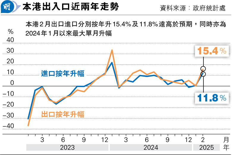【明報專訊】政府統計處公布本港2月份進出口數據,月內出口按年升15.4%,進口則按年升11.8%,升幅遠勝市場預期中位數的1.7%及0.7%,另本港於月內錄得有形貿易逆差363億元。有分析認為,市場預測的數字與實際公布數據的差距較大,不排除因2月份正值農曆新年,而有當月前後的數據撥進2月份之中。