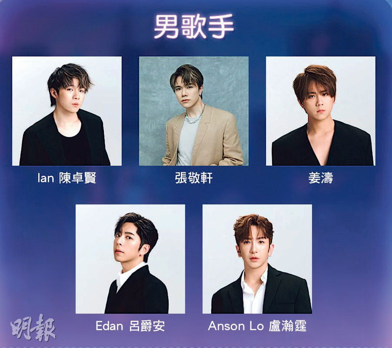 【明報專訊】ViuTV《CHILL CLUB推介榜 年度推介24/25》下月在啟德體藝館舉行,今屆設立21個項目獎項,其中12個獎項由觀眾投票,大會公布各獎項最後5強名單;5強男歌手包括姜濤、呂爵安(Edan)、陳卓賢(Ian)、盧瀚霆(Anson Lo)及張敬軒,繼續是「4鏡仔對張敬軒」局面。張敬軒是後來居上,曾並列7強的張天賦(MC)、周殷廷及林家謙最後出局。