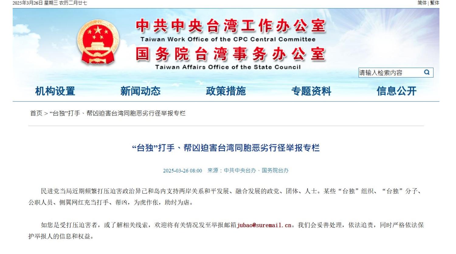 國台辦官網發布「台獨打手、幫兇迫害台灣同胞惡劣行徑舉報專欄」 (12:10)