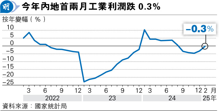 【明報專訊】國家統計局公布,今年1至2月合計全國規模以上工業企業利潤按年下降0.3%至9109.9億元(人民幣,下同),自去年9月以來持續下跌,降幅亦為期內最低。當局表示,外部環境日趨複雜嚴峻,部分工業企業仍面臨經營壓力。