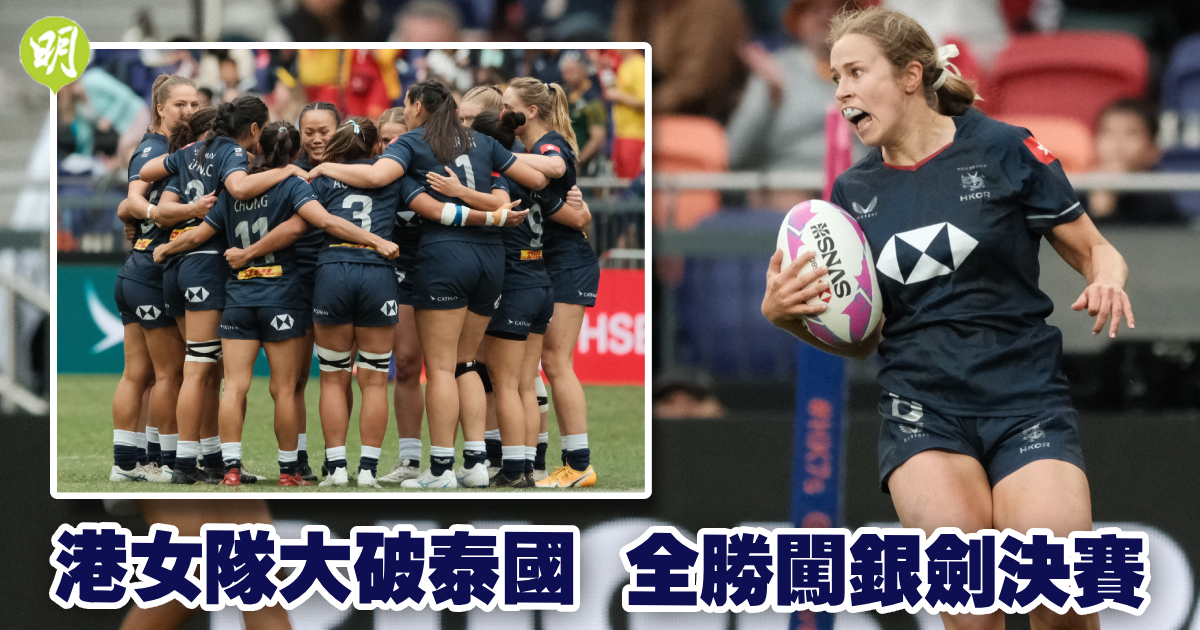 港女隊昨晚首仗以29:14反勝哈薩克隊,此戰有15人欖球代表潘慧欣首入名單,並擔正演香港七欖賽「地標」。先防守的港女隊早段成功壓制對手在後場,取得球權後即由林莎芘接連達陣取得領先。陳楚琪射入兩個附加罰球後,亦取得達陣並射入加踢,助港隊半場領先21:0。港隊下半場再靠韋諾蒔兩度建功,以及高香慧和陳楚琪達陣,並三度射入加踢,終以47:0零封泰國隊。港女隊兩戰全勝後晉級明午3時47分上演。