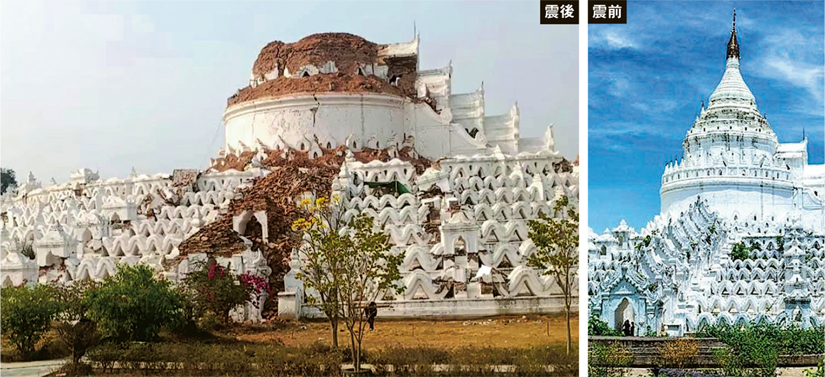 位於緬甸中部的古都包括蒲甘王朝的蒲甘(Bagan)、阿瓦王朝和東吁王朝的阿瓦(Ava)、貢榜王朝的實皆(Sagaing)和曼德勒(Mandalay,又稱瓦城)等,恐怕都受這場大地震重創——尤其實皆、阿瓦和曼德勒只隔着伊洛瓦底江。其中連接阿瓦和實皆的歷史名橋阿瓦橋已確認部分倒塌,而實皆和曼德勒以北的敏貢(Min Kun)則有著名的欣畢梅佛塔(Hsinbyume Pagoda,即白象佛塔)塔頂崩塌,曼德勒西南部的宗教名勝瑞薩延佛塔(Shwe Sar Yan Pagoda)同樣塔頂塌落。