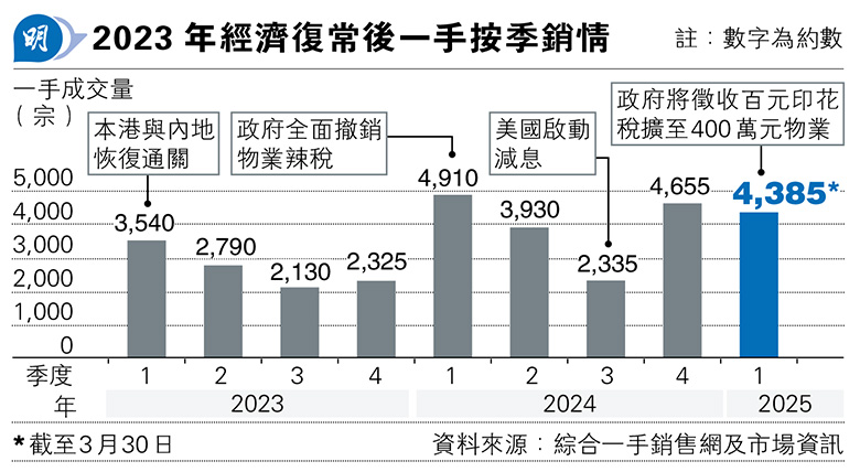 【明報專訊】新盤市况活躍,綜合市場資訊,3月截至30日,一手成交錄約2380宗,創去年10月錄約2995宗後的5個月新高,並帶動第一季整體一手成交增至約4385宗,其中三大新界新盤,期內共錄約1365宗成交,佔首季總體一手成交量的31%。不過,若與去年2月政府全面「撤辣」,刺激樓市即時升溫,令全季共錄約4910宗一手成交相比,按年則跌11%。