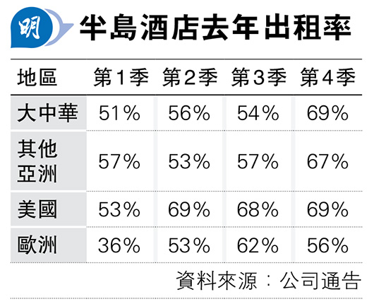 大酒店去年綜合收入按年升27%至102.9億元,當中包括出售7套倫敦半島住宅公寓所錄得收入34.52億元。而作為集團主要經常收入來源的香港半島酒店,去年收入按年升3%至10.7億元,出租率按年升6個百分點至49%,但平均房租按年跌5%。集團指樂見香港旅遊業整體氣氛漸好轉,又指傳統長途歐美旅亦重臨香港。至於香港市民興起北上,持續對本港餐飲業造成負面影響,但預期今年前景樂觀。