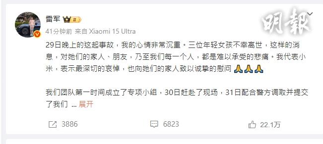 一輛小米SU7電動車3月29日晚在安徽高速公路撞路障起火,車內3名女大學生死亡。事件今天(4月1日)引爆輿論,小米創辦人雷軍晚上在新浪微博發帖稱,「等到此時,我覺得我不應該再等了,我必須站出來,代表小米承諾:無論發生什麼,小米都不會回避,我們將持續配合警方調查,跟進事情處理的進展,並盡最大努力回應家屬和社會關心的問題」。