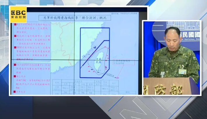 解放軍東部戰區4月1日組織海陸空與火箭軍等兵力,在台灣周邊展開聯合演訓。台灣軍方傍晚舉行記者會指出,大陸有71架次軍機、21艘軍艦、4艘海警船在台海周邊與西太平洋實施操演,山東號航空母艦位於台灣東南方220海里。