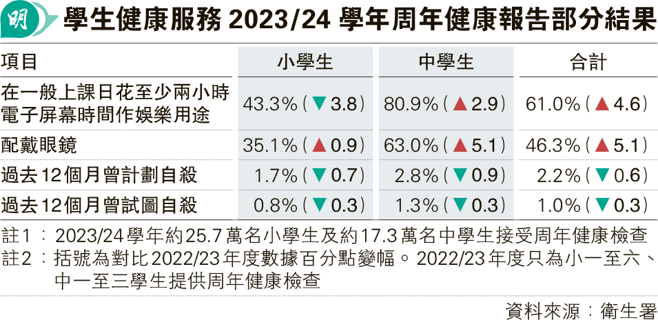 報告指出,2023/24學年完成健康評估問卷的小學生中,有43.3%在一般上課日花兩個小時或以上使用電子屏幕產品作娛樂用途,雖較上一學年47.1%低,但較疫前高;中學生比例達80.9%,較上一學年78%高。