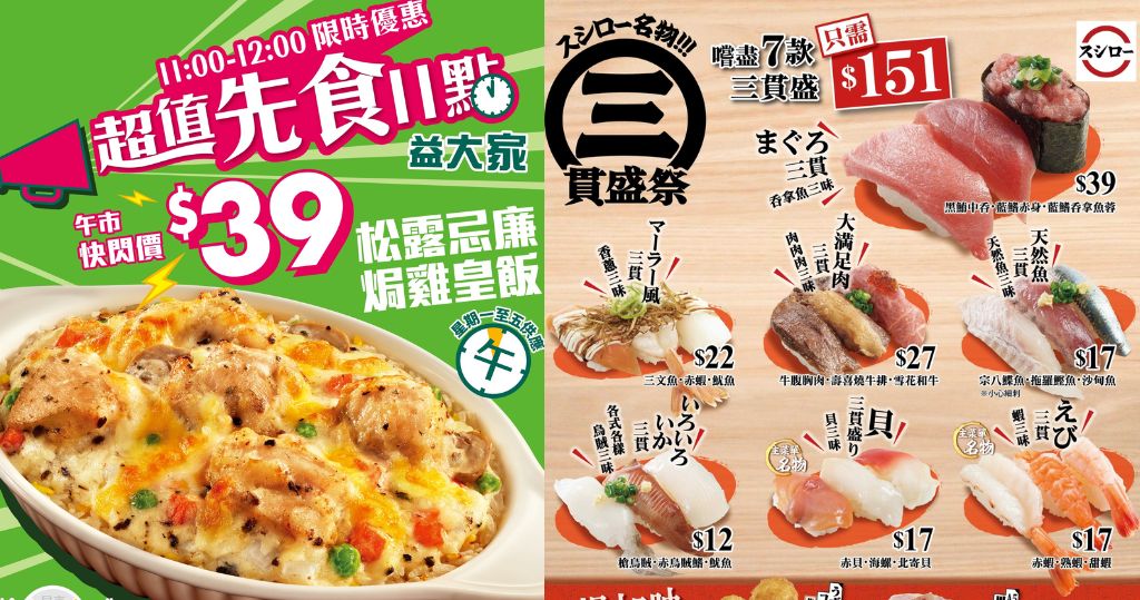 壽司郎三貫祭$12起 大家樂午市限時$39焗飯 美心MX晚市菜飯餐$58起|著數情報 (17:49)