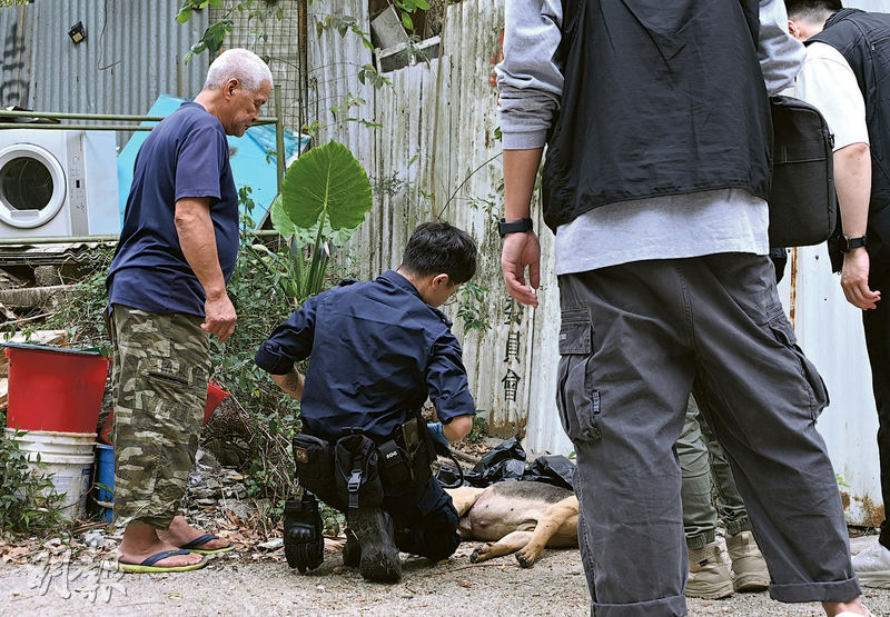 警方昨早8時許接獲男住戶報案稱,於古洞南路102B號飼養的狗離奇暴斃及失蹤。警員接報到場調查,並通知愛護動物協會到場協助。愛協人員即場逐一檢查暴斃的狗,並以膠袋包裹帶走。