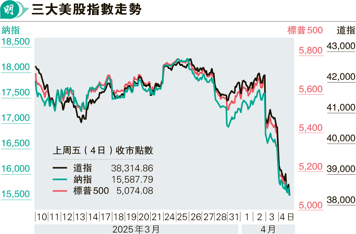 【明報專訊】特朗普早前宣布對等關稅後中國亦反擊,包括對美國進口商品反加34%關稅等,全球經濟陷陰霾,歐美市場哀鴻遍野,上周五(4日)美股跌幅比日前再加深,三大指數跌逾5%,以點數計道指跌2231點最多,跌幅則以標指最多,下跌5.97%。單是標指市值已快速蒸發逾5萬億美元。歐洲三大指數亦有逾4%跌幅。