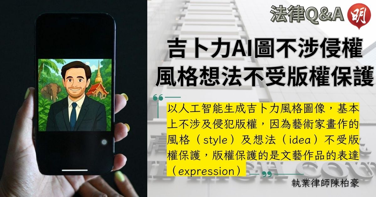 以人工智能生成吉卜力風格圖像,基本上不涉及侵犯版權,因為藝術家畫作的風格(style)及想法(idea)不受版權保護,版權保護的是文藝作品的表達(expression)。