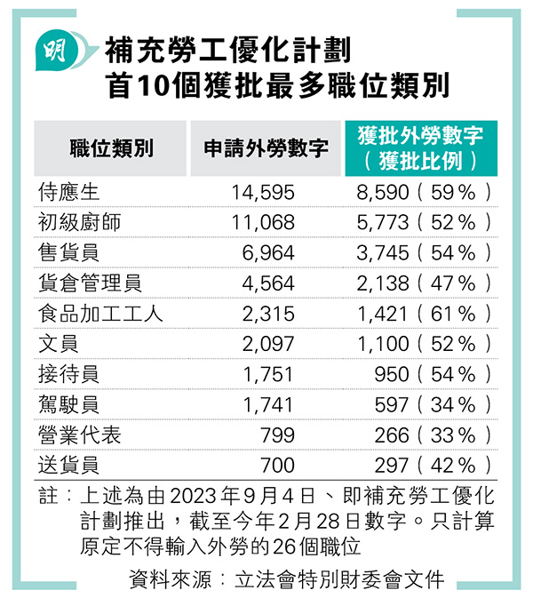 據勞福局數字,截至今年2月底,補充勞工優化計劃接獲11,342宗申請,涉98,065名外勞,當中71,623人擬從事過往一般不得輸入外勞的職位。期內獲批申請有7380宗,涉51,051名外勞,當中26,087人從事以往不可輸入外勞的26個職位,另8252人從事以往不可輸入的非技術或低技術職位,兩者合共34,339人。據前者分項數字,該批外勞最多為侍應生,有8590人(見表),其次是初級廚師(5773人)及售貨員(3745人)。