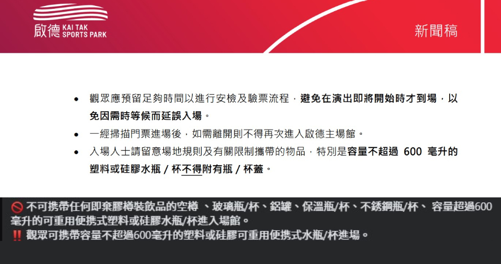 英國樂隊Coldplay明起於啟德體育園舉辦4場演唱會,主辦單位Live Nation昨公布,觀眾可攜容量不超過600毫升的塑料或硅膠可重用便攜式水樽或杯入場。不過,根據體育園今日公布的「溫馨提示」,提醒入場人士留意場地規則及違禁品,特別是容量不超過600毫升的塑料或硅膠水瓶/杯「不得」附有瓶/杯蓋。