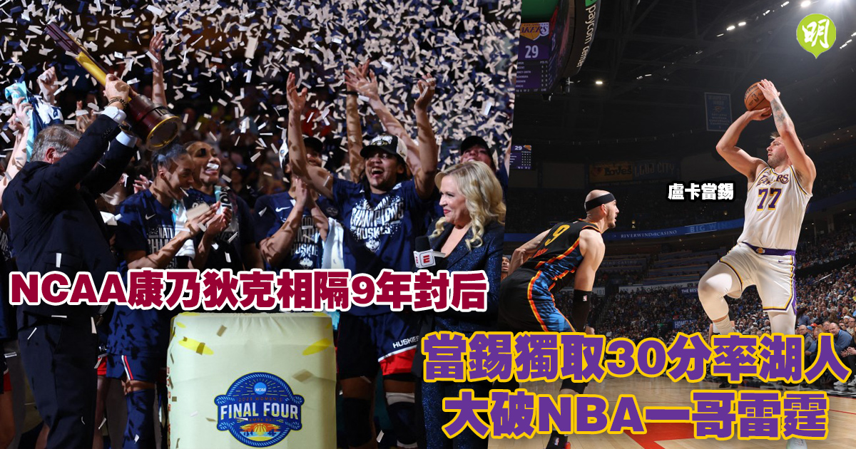 洛杉磯湖人今晨(7日)在NBA常規賽憑6名球員得分上雙,包括主將盧卡當錫獨取全場最高30分下,作客以126:99大勝聯盟一哥奧克拉荷馬雷霆,奪得兩連捷,賽後以48勝30負穩佔西岸第3。至於康乃狄克大學在全美大學體育協會(NCAA)一級女子籃球決賽以以82:59力克南卡羅萊納州大學,相隔9年再次封后。