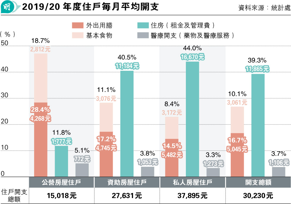 客觀事實十分清楚,就算是收入較低的公屋租戶,2019/20年度一般住戶的醫療開支平均只用了772元(或住戶開支5.1%),其外出用膳卻用了4268元(或28.4%)。即是說,這個一般公屋租戶每月單是外出用膳可以壓縮的幣值開支,理論上應有4000多元。我們還未評估公屋住戶相對來說十分低的住房開支比例。