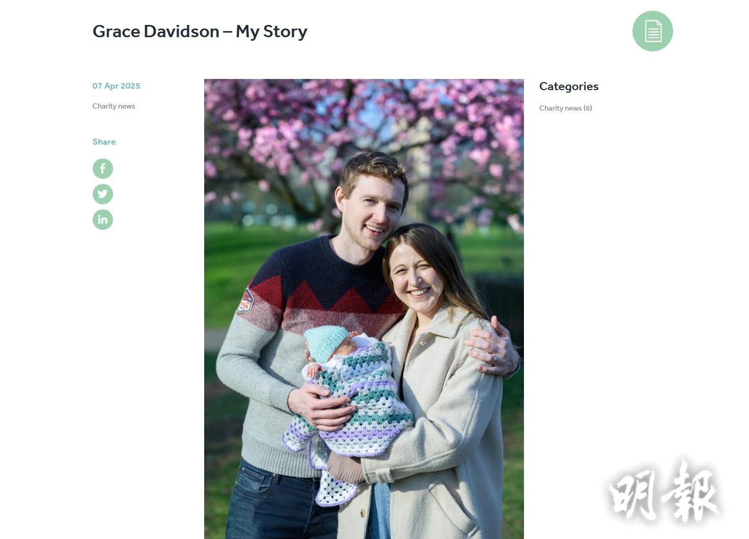 倫敦夏洛特女王和切爾西醫院(Queen Charlotte’s and Chelsea Hospital)發表聲明,指36歲的戴維森(Grace Davidson)患有一種名為「苗勒管發育不全症候群」(MRKH)的罕見疾病,天生子宮功能不全。她在2023年成為英國首名接受子宮移植的女性,子宮是由她42歲的姊姊珀迪(Amy Purdie)捐贈。珀迪已有兩名分別為10歲和6歲的女兒。