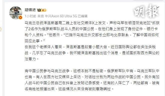 烏克蘭總統澤連斯基4月8日晚上在社交媒體X上發文,聲稱烏軍「抓獲了2名作為俄羅斯軍隊戰鬥人員的中國公民」。中國《環球時報》前總編輯胡錫進隨後在新浪微博撰文指出,有中國公民參與烏克蘭戰爭,這根本就不是秘密;俄羅斯軍隊中有,烏克蘭軍隊中也有。