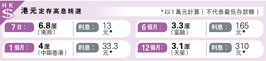 經濟 港元定存南商7年利率日見6.8厘 發佈於 9 個月 前 2025 年 4 月 10 日 By 明報 【明報專訊】港元定存高息精選7日見6.8厘,為南商客戶以兌換資金開立「倍高息定期存款」之優惠年利率 (請看附圖) 相關文章: Up Next 技術取勝:中免54元為重要支持 不要錯過 楊智佳:港股暫難轉強 先待關稅戰受累股反彈 繼續閱讀 贊助商 猜你喜歡