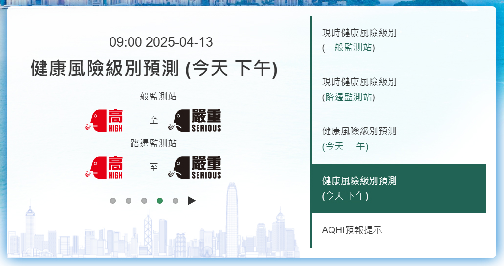 環境保護署(環保署)預測今日(13日)稍後時間,部分空氣質素監測站的空氣質素健康指數健康風險級別會達至「嚴重」水平。當健康風險級別達到甚高或嚴重水平時,兒童、長者及心臟病或呼吸系統疾病患者應盡量減少或避免體力消耗及戶外活動。一般市民應減少或盡量減少戶外體力消耗,以及減少在戶外逗留的時間,特別在交通繁忙的地方。