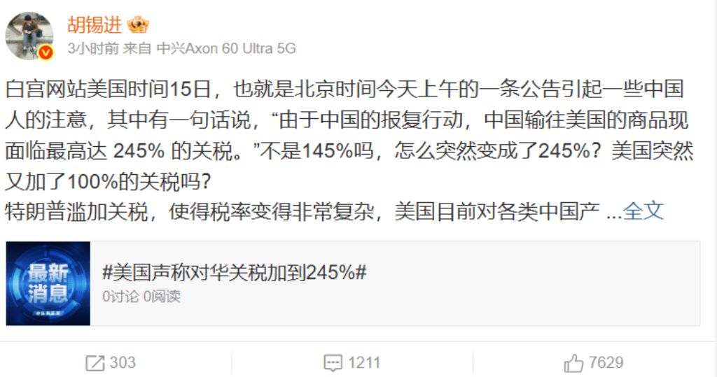 白宮宣布對中國輸往美國的商品現面臨最高達245%的關稅。環時前總編輯胡錫進今日(16日)撰文指出,在對華關稅已經高達145%的情況下,特朗普繼續增加,已經沒有經濟學上的實際意義,只會讓世人看到白宮「瘋了」,而且手中已經無牌,拿着關稅數字瞎比劃唬人。色厲內荏就是指的這種虛張聲勢。