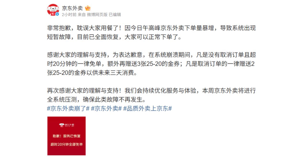 京東外賣稱,為表歉意,在系統崩潰期間,凡是沒有取消訂單且超時20分鐘的一律訂單免費,額外再贈送3張優惠券,取消訂單者亦可獲贈2張優惠券。(九派新聞/京東外賣微博)