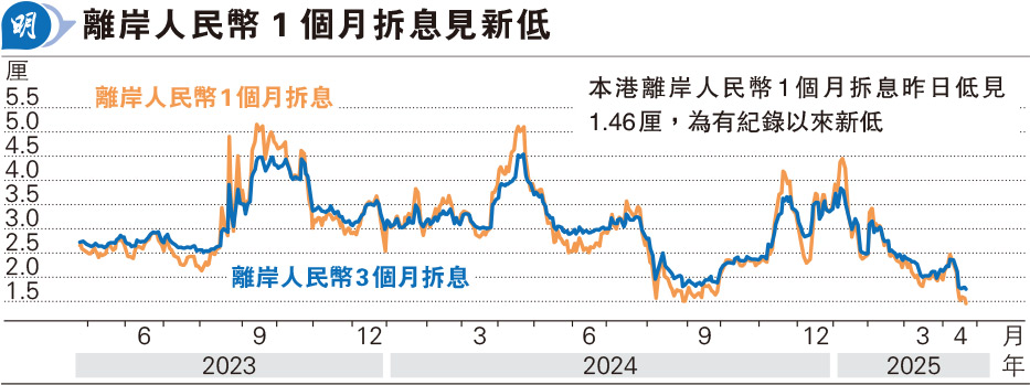 至於交易員近期借入離岸人民幣的隔夜拆息,亦徘回於0.55厘的低位,反映離岸人民幣拆息成本低廉,為押注人民幣進一步貶值提供便利。彭博社報道,近期全球資金撤出美元資產,隔夜彭博美元指數觸及2023年末以來的最低水平,並引述法巴大中華區外匯利率策略主管王菊表示:「美元太弱,人民銀行沒需要出手支撐人民幣,離岸人民幣拆息成本隨之下降。」