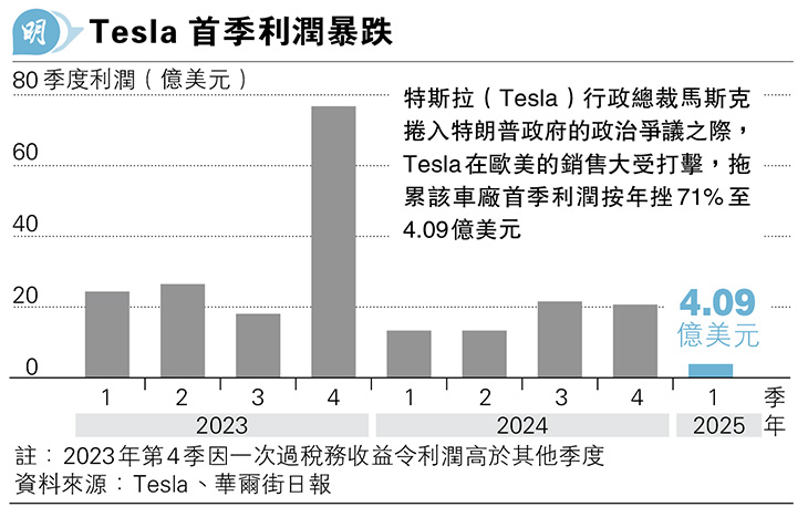 【明報專訊】特斯拉(Tesla)(美:TSLA)行政總裁馬斯克為特朗普政府領導政府效率部(DOGE)引發巨大爭議,令Tesla成為歐美消費者的抵制目標,加上與中國電動車品牌的競爭趨於激烈,Tesla首季利潤大跌71%至4.09億美元。市場憂慮馬斯克參與政治為Tesla帶來品牌危機,不過馬斯克強調,銷售減少是由於宏觀經濟趨勢造成的需求下降,與品牌無關。他已預告下月起將重返Tesla,分配給DOGE的時間將縮減至每周一兩天。儘管Tesla仍可能受到5月3日起徵收的汽車零件關稅影響,但馬斯克重申,其電動車在美國本土組裝,是最不受關稅影響的車廠,其股價早段最多升7%。