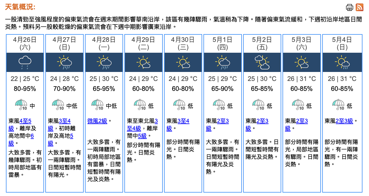 即時熱點 天氣|天文台:周六驟雨較多有雷暴 稍涼氣溫介乎22至25°C (21:35) 發佈於 8 個月 前 2025 年 4 月 25 日 By 明報 天文台表示,本港地區明日(26日)天氣預測大致多雲,有幾陣驟雨,初時驟雨較多,局部地區有雷暴。明日稍涼,氣溫介乎22至25°C。吹和緩至清勁偏東風,明日離岸及高地間中吹強風。展望隨後數日日間天氣炎熱,但下周初仍有一兩陣驟雨。(天文台) 相關文章:天文台天氣天氣速遞編輯推介 Up Next SOGO崇光感謝祭啟德店推1元限量商品吸客 廣東遊客:來香港刺激經濟【短片】 (20:14) 不要錯過 天文台:黃色暴雨警告信號取消 (05:19) 繼續閱讀 贊助商 猜你喜歡 天氣|天文台:日間乾燥溫暖 最高25°C (08:14) 天氣|天文台:周三大致天晴乾燥 市區最低19°C (21:08) 天氣|天文台:大致天晴 最高23°C (08:14) 天氣|天文台:周二天晴乾燥 早上市區最低18°C (20:52) 天氣|天文台:有陽光及乾燥 日間最高20°C (08:17) 寒潮 | 廣州最低氣溫跌至1.7℃ (16:58)