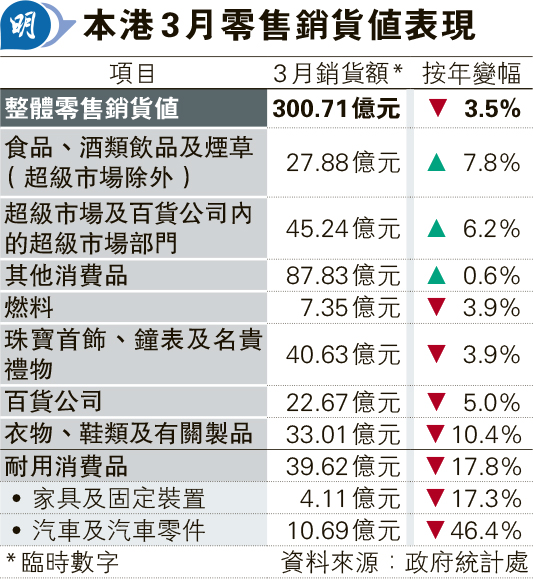 【明報專訊】政府統計處公布,香港今年3月零售業總銷貨價值臨時估計為300.71億元,按年下跌3.5%,已連跌13個月。扣除價格變動後,3月零售業總銷貨數量的臨時估計按年跌4.8%。今年首季,零售業總銷貨價值的臨時估計按年下跌6.5%。零售管理協會主席謝邱安儀表示,3月零售表現在低基數效應下跌幅收窄,合乎協會預測,但料今個月市道較淡靜、加上貿易戰窒礙市民消費意欲,整體零售表現不會理想。