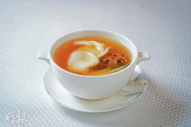菜單中還有海景軒多道長青的招牌菜。好像頭盤的茶香熏素鵝一直是餐廳熟客的至愛,廚師把腐皮煨入香菇素湯,再包裹紅蘿蔔、西芹和冬菇絲蒸煮,最後以蔗糖和茉莉花茶葉煙熏15分鐘,腐皮多汁美味,散發清新煙熏香。至於五糧液美國黑豚肉叉燒,則以五糧液、桂花蜜等醃過,肉質鬆軟並帶桂花香。另在餐牌上有30多年歷史的手工菜「金華玉樹雞」,此菜工序繁複,廚師先把三黃雞於薑葱水內浸熟,再把它浸入瑤柱蝦米水至入味,接着起出雞肉,搭配金華火腿片和冬菇片蒸煮後,淋上芡汁,一次過同吃雞肉火腿冬菇片,帶香滑又鹹鮮的複雜風味。而砂鍋梅菜鴛鴦豬炒飯的鴛鴦是指煎香的燒腩肉與帕爾馬火腿,還加入惠州甜梅菜提味。蔬菜還有三色津白及金磚豆腐。記者率先試過部分菜式,味道紮實,不會過濃或太油膩,而且手工菜和滋補食材,甚有大時大節回家吃飯的味道,感覺暖心。