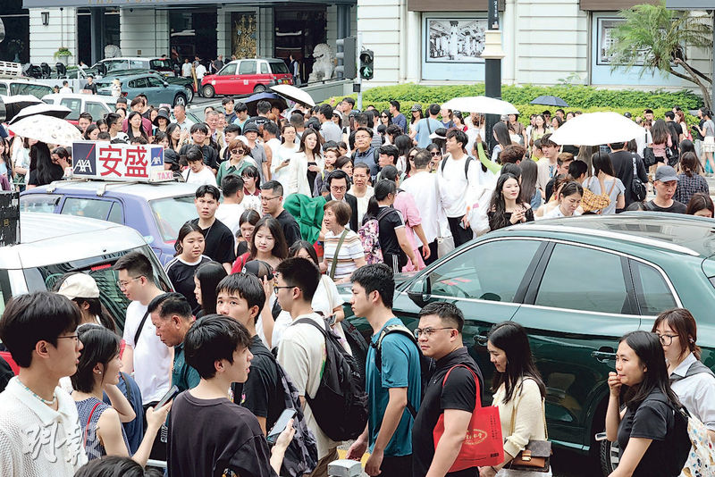 【明報專訊】「現在不是『暈車』是『暈人』!」內地五一長假昨日來到第三天,尖沙嘴、中環一帶依然人山人海。到星光大道跟金像獎女神像自拍,畫面內全是別人;坐天星小輪,有旅客抱怨人多,「廈門的鼓浪嶼(郵輪)更好玩!」若去乘搭中環摩天輪,職員稱要排隊3小時。人頭湧湧中不乏「窮遊特種兵」,自攜肉鬆麵包當午膳,稱要把握時間趕景點;亦有旅客豪言擲「幾個(萬)」購買藥妝、護膚品等。