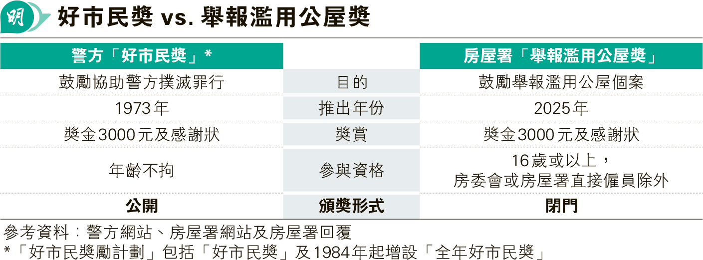 至於房協,1月22日回應申訴專員公署主動調查報告時曾預告4月推出「舉報濫用公屋獎」,之後未再發稿宣傳,直至4月底的季刊《房協動態》才有介紹。房協稱,截至4月23日接獲4宗參與獎勵計劃舉報個案,會適時舉行簡單小型頒獎禮,時間及形式待定,得獎者可選擇出席否。