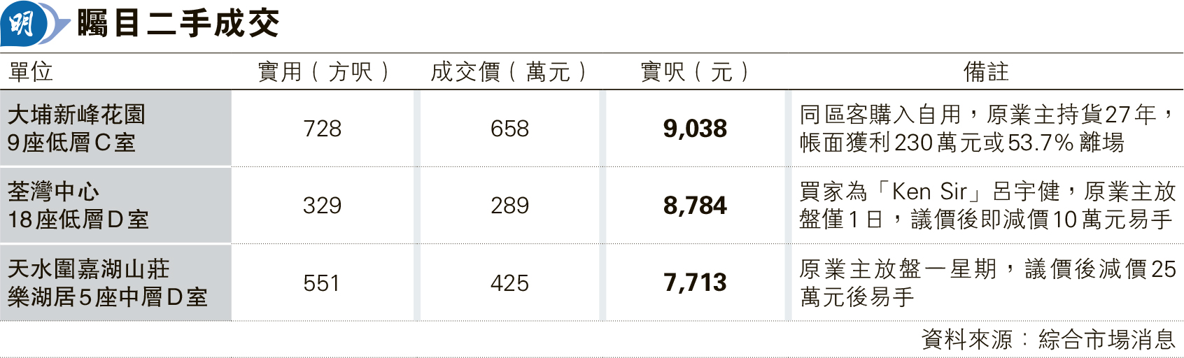 另中原分行經理楊頌堯表示,大埔新峰花園錄成交,9座低層C室,實用728方呎,3房連套房間隔,開價約680萬元,議價後減價22萬元或3.2%、以658萬元易手,實用平呎9038元。