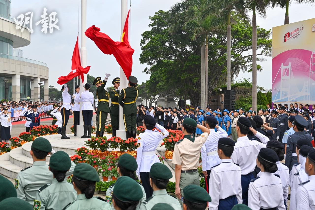 今年是五四運動106周年,亦是抗日戰爭勝利80周年,由政府資助、香港各界青少年活動委員會主辦的「紀念中國人民抗日戰爭暨世界反法西斯戰爭勝利80周年金紫荊廣場五四升旗禮」今早(4日)舉行。政府司長陳國基、中聯辦副主任劉光源、外交部駐港公署副特派員潘雲東,及3名東江縱隊港九獨立大隊老兵到場觀禮,亦有1200名青少年制服團隊成員及中小學生參與。
