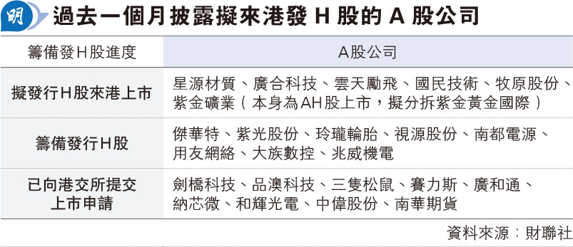 【明報專訊】據內媒統計,過去一個月至少有23家A股上市公司擬赴港上市,當中有9家已遞表申請。同時,港交所(0388)上周五(2日)在其播客中提到,目前有約30公司計劃在香港A+H上市。