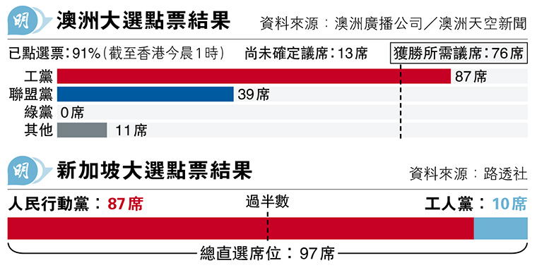 【明報專訊】澳洲和新加坡執政黨俱在上周六(3日)舉行的國會大選取得佳績,一些分析歸功於選民在「特朗普2.0」下對全球經貿前景的不安。其中澳洲財長查默斯昨天更表明,工黨政府將優先處理美中貿易戰帶給全球經濟的「陰霾」。